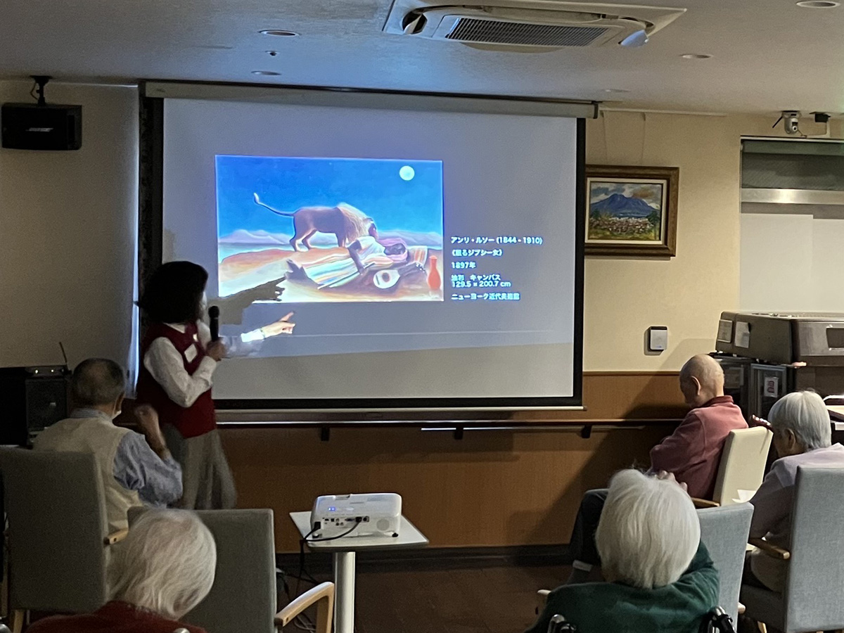 あと、ホームのアクティビティとして面白いのは「アートセラピー」を月に1回開催していることですね。有資格者に来てもらい、認知心理療法に基づいて行っています。絵を見ながら心の中を紐解き、心をほぐすというセラピーです。ご入居者も楽しみに参加され、終わると皆様とても顔が明るくなっています。